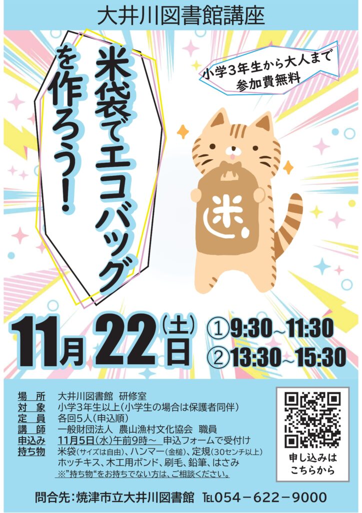 申込み:11月5日(水)午前9時以降に申し込みフォームまたは大井川図書館へ電話、窓口でお申し込みください。