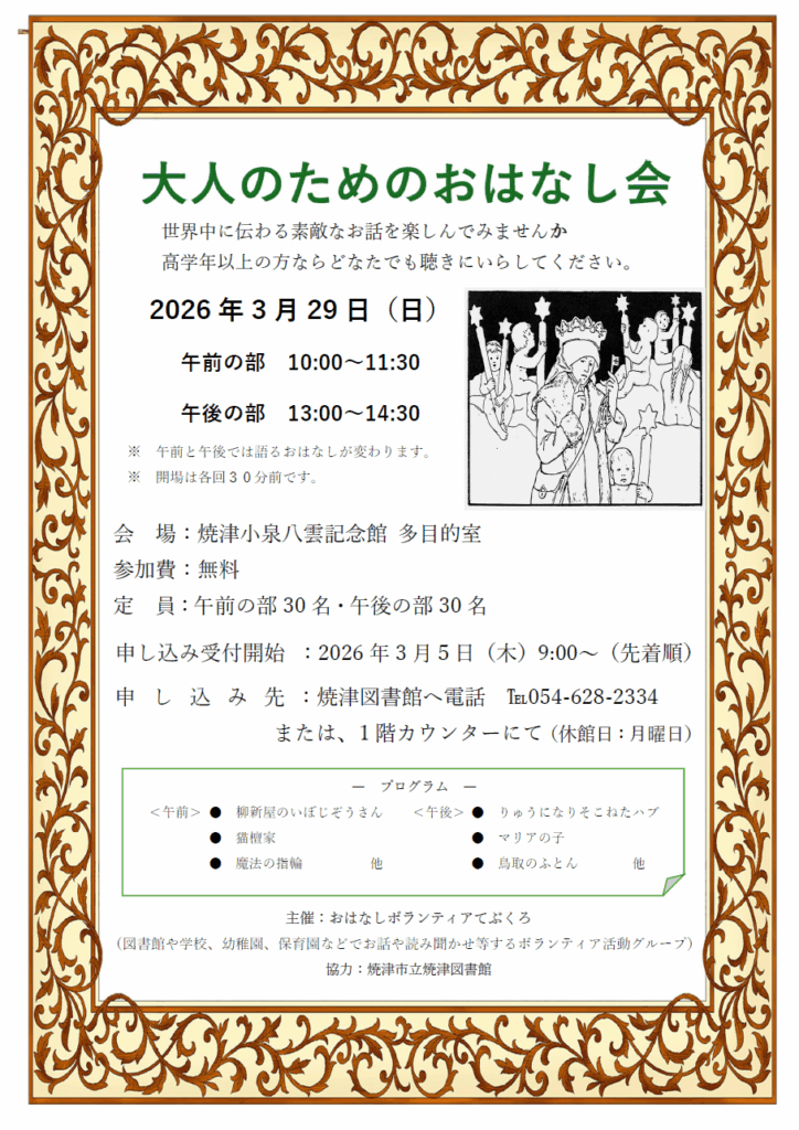 | 申込・問い合わせ先 | 焼津図書館 TEL:054-628-2334 |