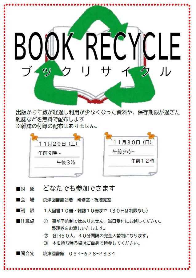 ・ブックリサイクル及びその他のイベント開催のため、11月27日(木)から12月3日(水)まで、研修室及び視聴覚室はご利用いただけませんので、ご注意ください。