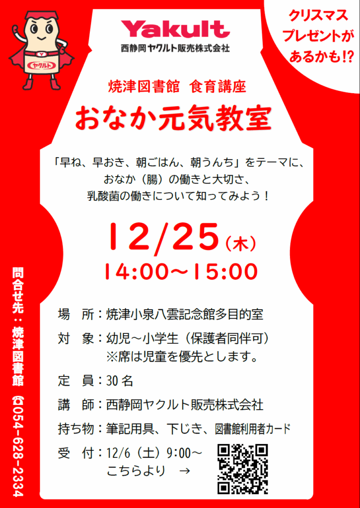 【参加対象の幅を広げました】焼津図書館食育講座 ヤクルト「おなか元気教室~早ね、早おき、朝ごはん、朝うんち~」
