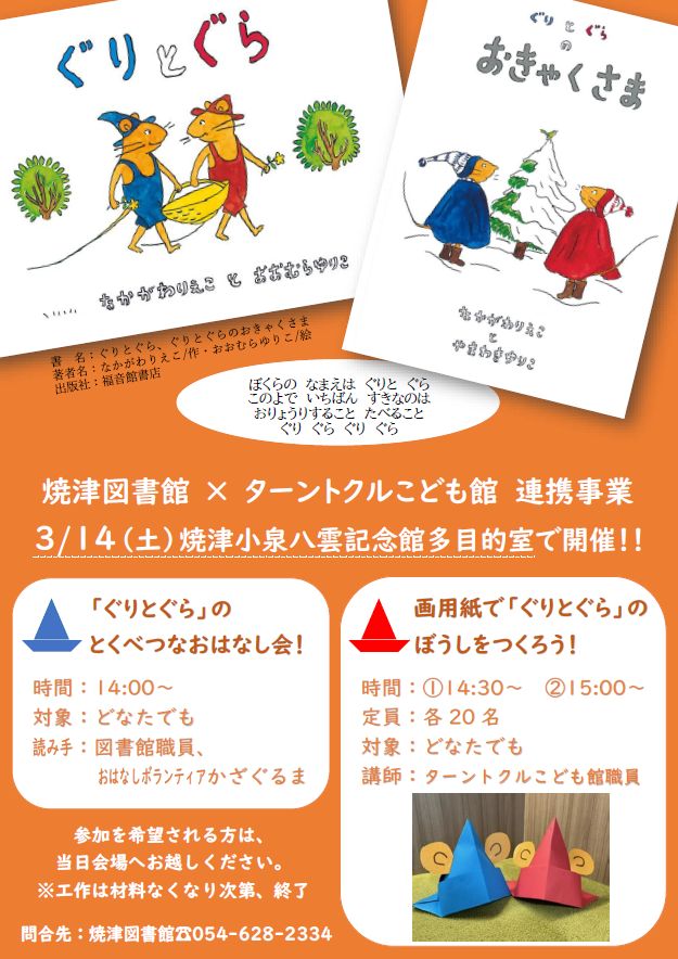 【焼津図書館×ターントクルこども館】ぐりとぐらの特別なおはなし会&ぐりとぐらの帽子をつくろう!